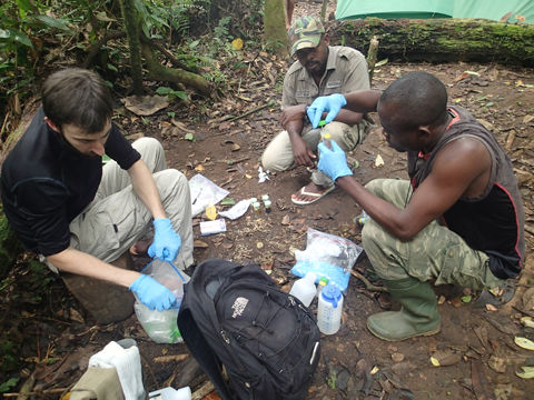 Dr. Katy Gonder and graduate student Paul Sesink Clee processing chimpanzee fecal samples in Lobeke National Park, Cameroon.