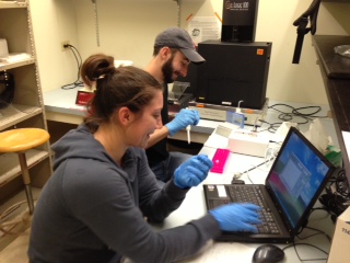 Graduate students Matthew Mitchell and Elise Caron are quantifying chimpanzee DNA extracts using a NanoDrop spectrophotometer.